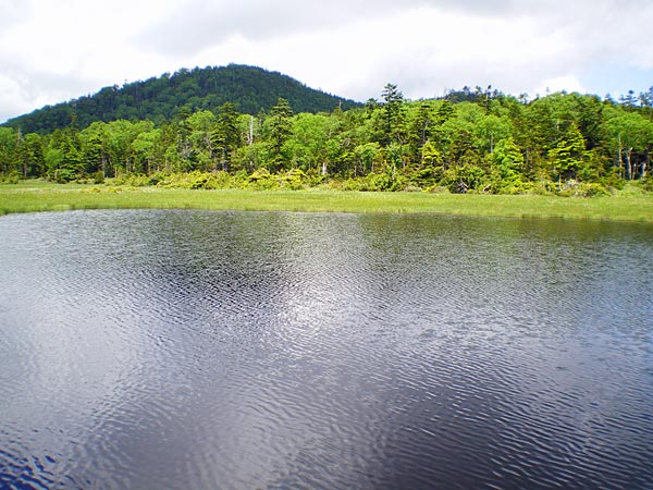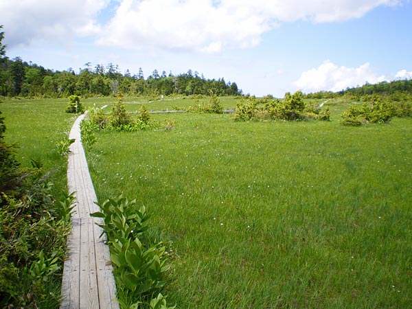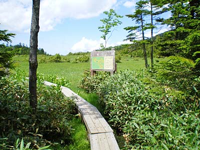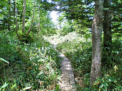 それからも道に危険な所はなく、汗を拭き拭き登っていくが鹿もいなければ熊もいない.ウグイスが結構近くで鳴いている.日光沢温泉から一時間半、休憩地に出た.前方が少し開け白根山が良く見える.ベンチも置かれていてゆっくりしたいところだが、此処は休まずに登って行った.やがて、傾斜も緩くなってアスナロやトウヒといった大きな木を見ながらのダラダラ登りを続けるが、これが意外に長くボディブロー. 右、涸れ沢沿いに歩き笹原の道を少し行くと突然目の前が開けた.木道が長く続く鬼怒沼に到着だ.おおーーーー、広い.風が吹いていて涼しいーーー.開放感200点満点とはこの事だ(意味は特にないが(^^; ) |