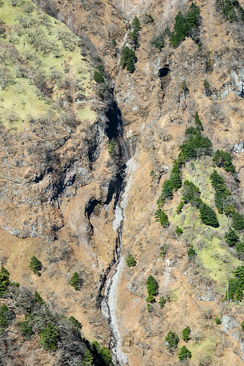 ![]() 中央付近が日向ダム 笹帯とその下部は天狗尾根 |